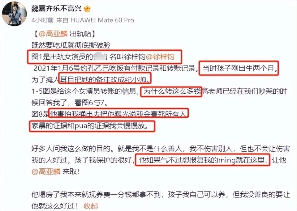 魏嘉公开了大量的聊天记录和转账记录来证明自己的言论。她描述了高YL如何在她产后不久就开始与徐梓钧交往,以及他们的聊天记录中充斥着对密会的安排。更令人瞠目的是,魏嘉还公布了大量的转账记录,显示高YL曾多次向徐梓钧转账资金,单笔金额多在几万元人民币,其中最大一笔高达三万八千元。如果再有其他未曝光的转账记录,那么这一金额将会更加惊人。